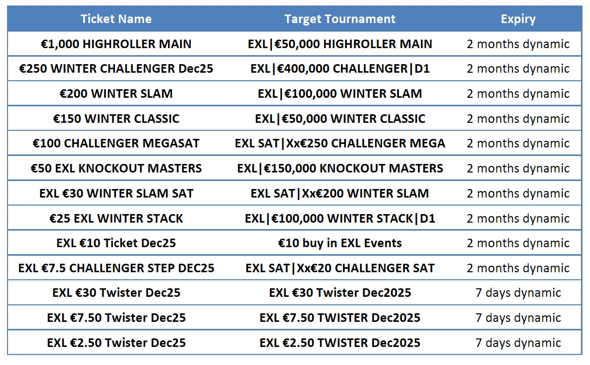 - “€1,000 HIGHROLLER MAIN”, “€250 WINTER CHALLENGER Dec25”, “€200 WINTER SLAM”, “€150 WINTER CLASSIC”, “€100 CHALLENGER MEGASAT”, “€50 EXL KNOCKOUT MASTERS”, “EXL €30 WINTER SLAM SAT”, “€25 EXL WINTER STACK” and “EXL €7.5 CHALLENGER STEP DEC25” entry tickets are valid only in “EXL” Elite Series XL: tournaments during the Promotion Period and expire 2 months after having been issued. After the Promotion Period they will be linked to all tournaments.